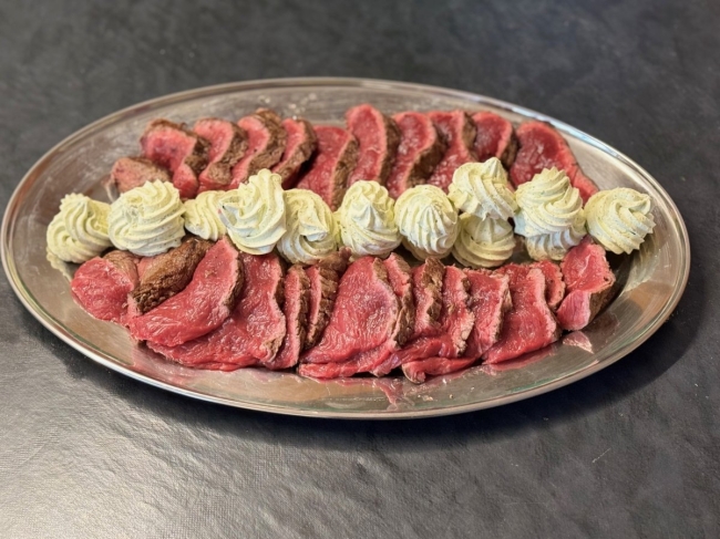 coupée en tranche accompagné d'un beuure maison servi sur un plateau en inox prêt à être chauffé sur un réchaud.
